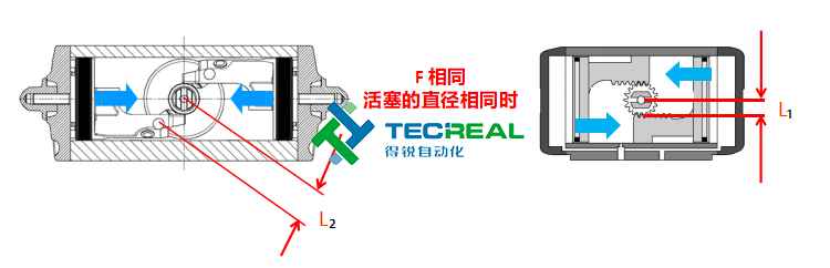 第二步,我們看兩者在扭矩轉換時的半徑。上圖為兩者工作時扭矩轉換半徑示意圖,左邊為撥叉式結構,右邊為齒輪齒條式結構。從圖中顯示的“L”值可以看到,左邊在進行扭矩轉換時,L值會變大,而右邊的齒輪齒條式則是永遠不變。經過我們的測試,在活塞直徑相同的時候,OMAL的撥叉式氣動執行器比普通的齒輪齒條式氣動執行器的扭矩大40%左右。