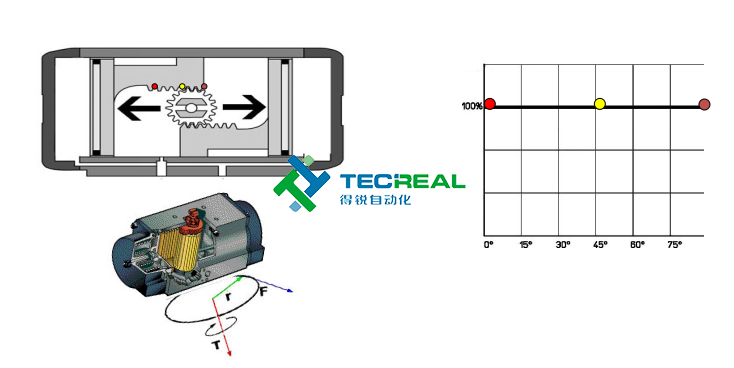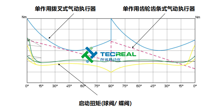 第三步,我們看兩者在輸出扭矩時的變化。圖1是撥叉式執行器工作時扭矩變化圖,圖2位齒輪齒條式工作時扭矩變化圖。可以看到撥叉式氣動執行器在開啟和關閉時扭矩蕞大,而齒輪齒條式輸出的扭矩則是一成不變的。學過物理的都知道,物體由靜止變為運動狀態時,需要克服的摩擦力蕞大,相應就要需要輸出蕞大的力。