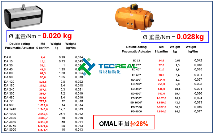 再看單動(dòng)型號(hào),OMAL氣動(dòng)執(zhí)行器 ? 重量/Nm = 0.046 kg,而埃爾蒂克? 重量/Nm = 0.078kg,OMAL比它輕39%。