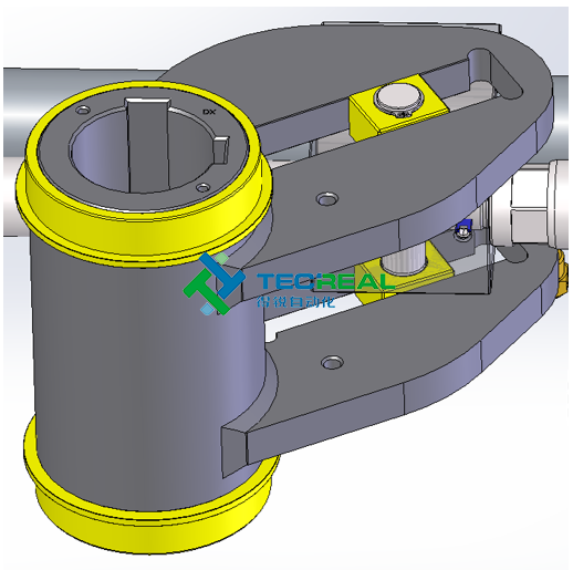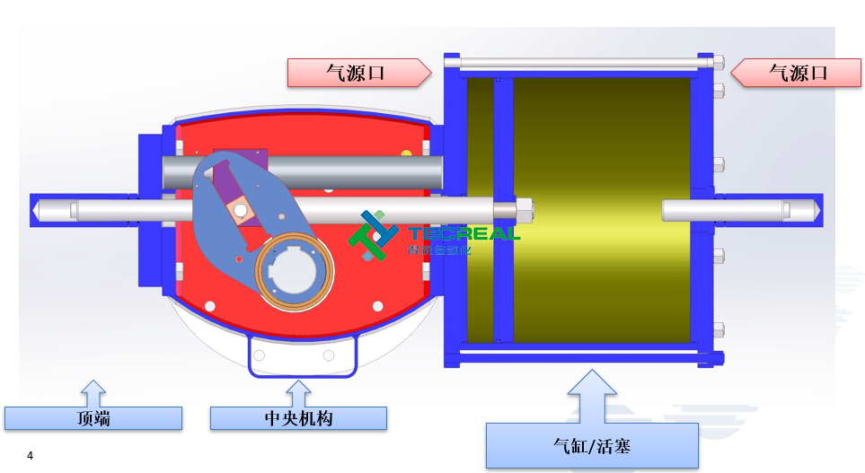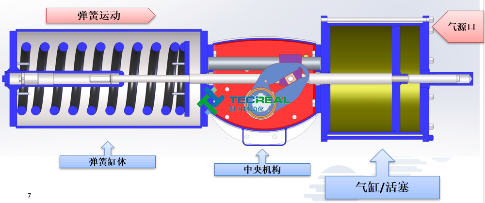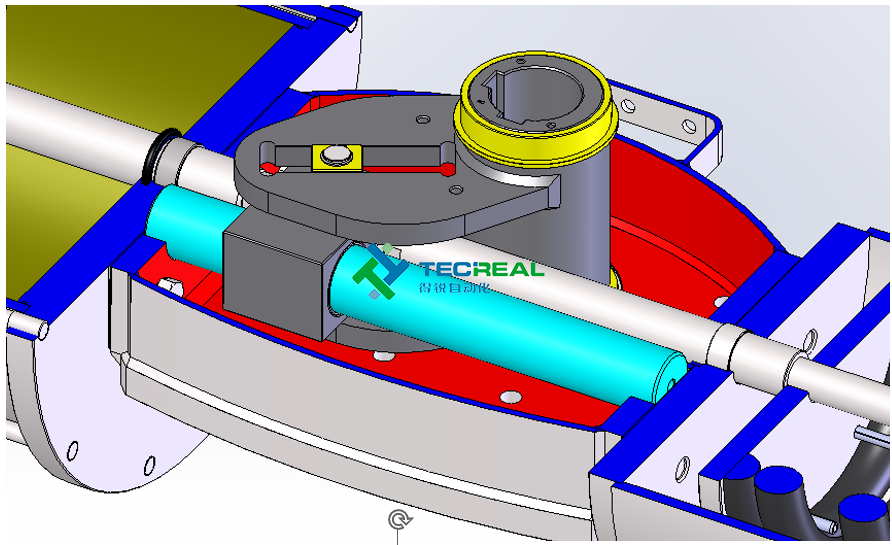 這種執行機構,撥叉是位于中央機構控制活塞運動,但與氣缸活塞是分開的,這就解決了很多的密封問題,并且允許使用各種氣體或是液體控制,而不是只有空氣作為氣源.例如:水,氣體甲烷等。