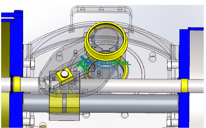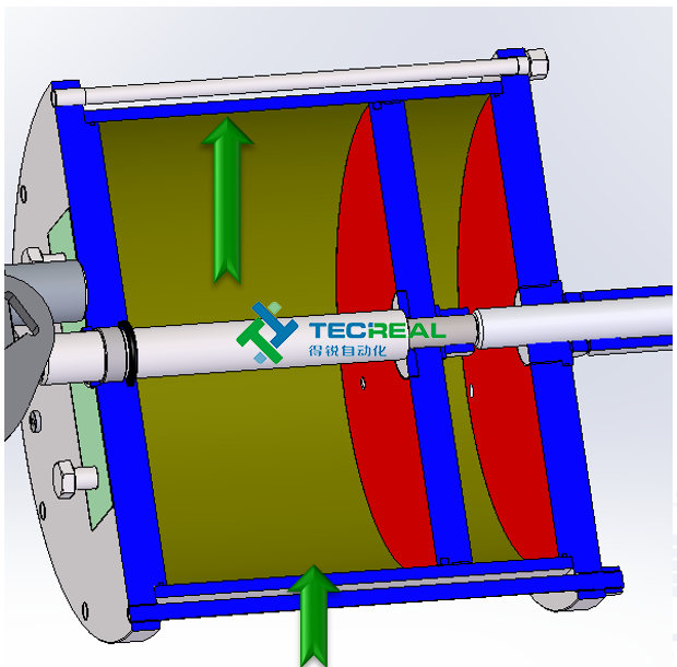 3.導桿(淺藍色)材質為鋼(42Cr Mo4) 能夠承受高的側向力,確保足夠對活塞桿的承受力。此外,導桿表面鍍鉻,以確保最大程度的防腐蝕性,減少與滑塊相互運動的摩擦阻力。