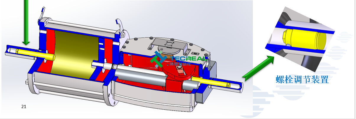 8.總的運行角度 100 ° (-5 ° +95 °),調節螺栓可在執行器打開或關閉的位置上進行± 5 °的調節,而且不管是雙作用還是單作用,調節螺栓都有保護帽,確保功能的完整性。