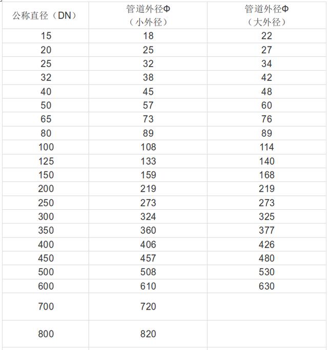 (1) 管件尺寸與閥門通徑及英寸對照表:
