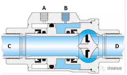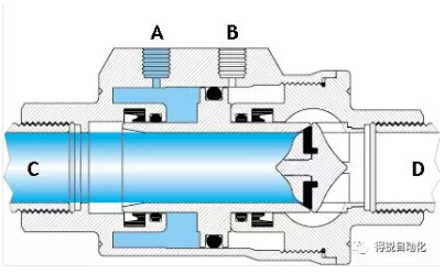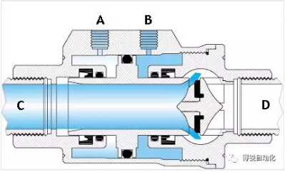 當“A”孔進氣(“B”孔排氣)時,活塞向“D”口移動并壓在閥座密封上,此時閥門關閉。單動常閉型的彈簧安裝在“A”端腔室。在非控制時,活塞是壓在閥座上,所以其最常用的是關閉位。