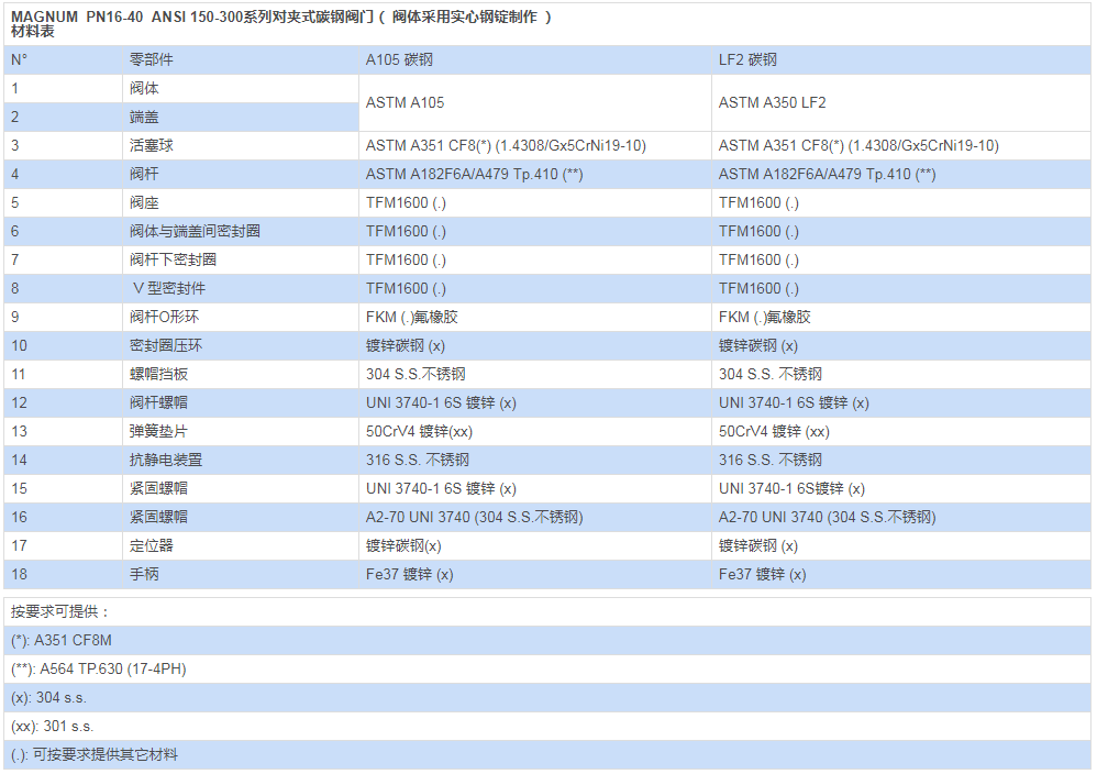 材料及等級:對ANSI 美標閥門,符合ASME B16.34 標準;對PN 公稱壓力閥門,符合EN12516 標準